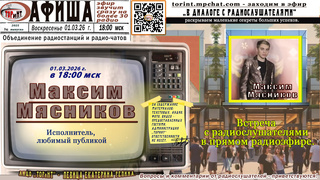 🚀✨🎤📻 #прямойэфирТОРиНТ 🎤✨⭐️ 01.03.26 года в 18:00 мск, на всех онлайн радиостанциях и радио-чатах Объединения #ТОРиНТ, состоится встреча с молодым, но уже успешным исполнителем, любимцем аублики - Максимом Мясниковым.