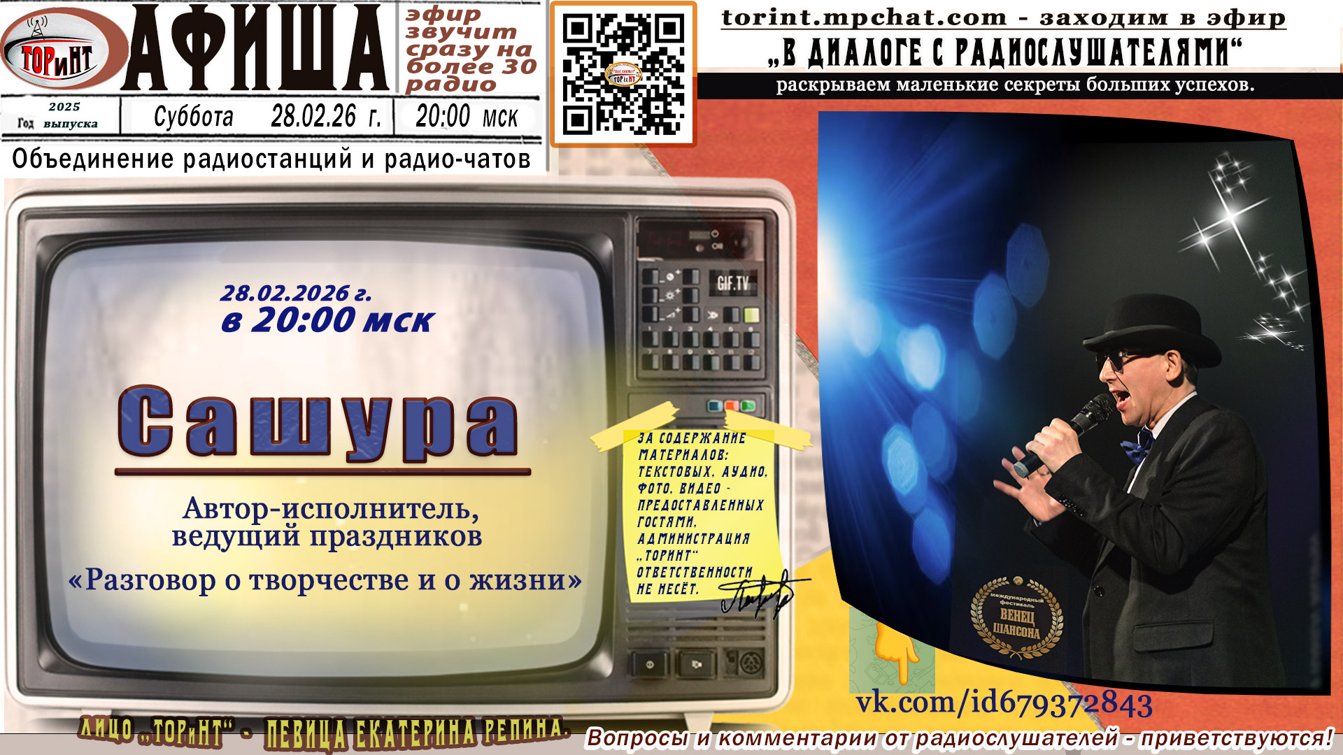 🚀✨🎤📻 #прямойэфирТОРиНТ 🎤✨⭐️ 22.02.26 года в 18:00 мск, на всех онлайн радиостанциях и радио-чатах Объединения #ТОРиНТ, состоится событийная встреча, тут будет юмор, замешанный с размышлениями, будут песни и, очень важно, живой разговор. «В эфире Наталья Урбанская,» — «всему свету по секрету“ сообщит Сергей Тюменский, — и всем нам станет до разговоров.