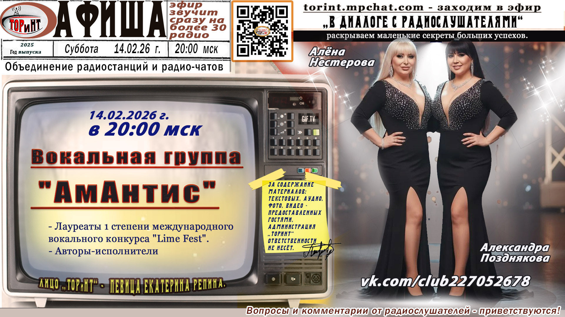 ❗️❗️❗️🔥Внимание, 14.02.26 г. в 20:00 мск, в прямом эфире #ТОРиНТ состоится встреча с авторами премьеры. Не упускайте возможность задать девушкам вопросы и услышать на них ответы.
